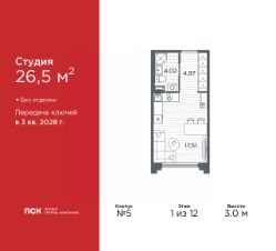 1-комн. квартира-студия в Клубный квартал "Ассамблея" на 1 этаже. Квартира без отделки, полностью готова к ремонту. Общая площадь: 26.5 кв.м., площадь гостиной 17.51 кв.м., из которых 5 кв.м. выделено под кухонную зону. Все окна выходят на одну сторону. В квартире один совмещенный санузел. Высота потолков 3.0 м.