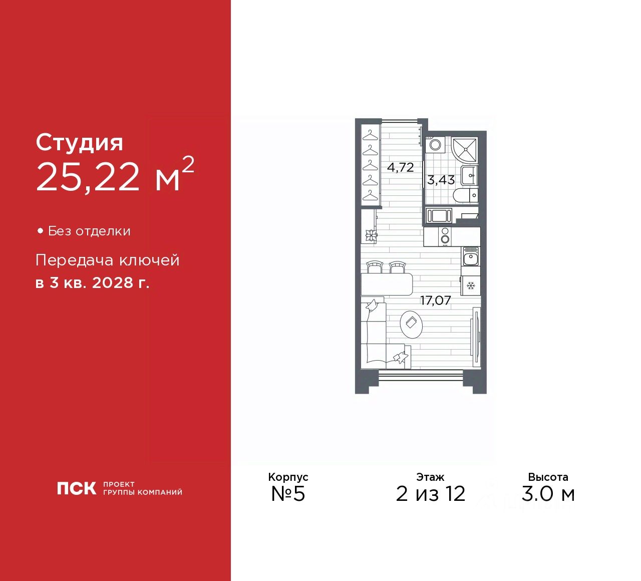 Продается однокомнатная квартира-студия в Клубный квартал "Ассамблея" на 2 этаже. Квартира без отделки, после получения ключей можно делать ремонт. Общая площадь: 25.22 кв.м., площадь гостиной 17.07 кв.м., из которых 5 кв.м. выделено под кухонную зону. Все окна выходят на одну сторону. В квартире один совмещенный санузел. Высота потолков 3.0 м.