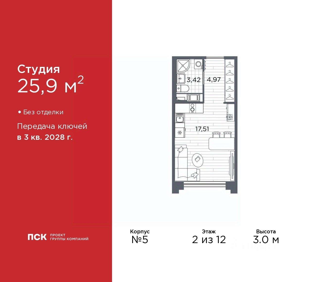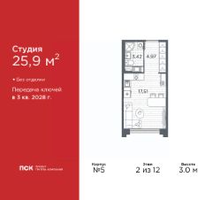 Однокомнатная квартира-студия в Клубный квартал "Ассамблея" на 2 этаже. Квартира без отделки, новый владелец может сделать ремонт по своему проекту. Общая площадь: 25.9 кв.м., площадь гостиной 17.51 кв.м., из которых 5 кв.м. выделено под кухонную зону. Все окна выходят на одну сторону. В квартире один совмещенный санузел. Высота потолков 3.0 м.
