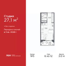 Просторная 1-комн. квартира-студия в Клубный квартал "Ассамблея" на 6 этаже. Квартира без отделки, после выдачи ключей можно делать ремонт. Общая площадь: 27.1 кв.м., площадь гостиной 17.51 кв.м., из которых 5 кв.м. выделено под кухонную зону. Все окна выходят на одну сторону. В квартире один балкон, один совмещенный санузел. Высота потолков 3.0 м.
