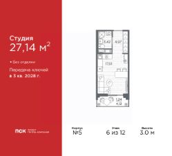 Просторная однокомнатная квартира-студия в Клубный квартал "Ассамблея" на 6 этаже. Квартира без отделки, после оформления собственности можно делать ремонт. Общая площадь: 27.14 кв.м., площадь гостиной 17.51 кв.м., из которых 5 кв.м. выделено под кухонную зону. Все окна выходят на одну сторону. В квартире один балкон, один совмещенный санузел. Высота потолков 3.0 м.