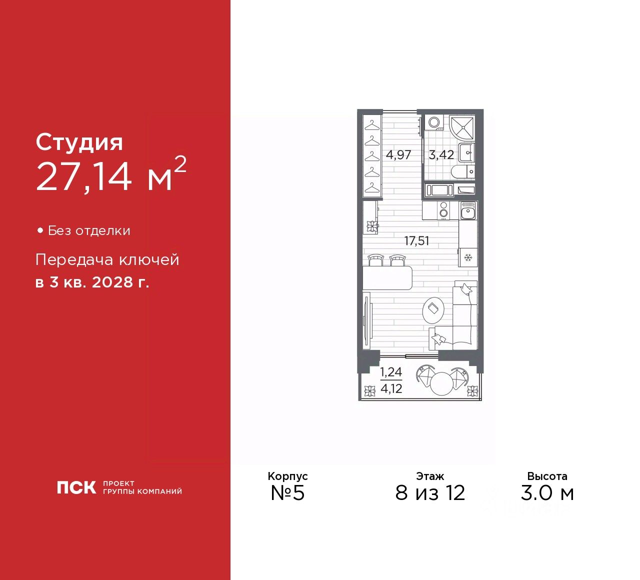 Продается однокомнатная квартира-студия в Клубный квартал "Ассамблея" на 8 этаже. Квартира без отделки, полностью готова к чистовой отделке и дальнейшему ремонту. Общая площадь: 27.14 кв.м., площадь гостиной 17.51 кв.м., из которых 5 кв.м. выделено под кухонную зону. Все окна выходят на одну сторону. В квартире один балкон, один совмещенный санузел. Высота потолков 3.0 м.