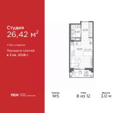 1-комн. квартира-студия в Клубный квартал "Ассамблея" на 8 этаже. Квартира без отделки, после оформления собственности можно делать ремонт. Общая площадь: 26.42 кв.м., площадь гостиной 17.07 кв.м., из которых 5 кв.м. выделено под кухонную зону. Все окна выходят на одну сторону. В квартире один балкон, один совмещенный санузел. Высота потолков 3.0 м.