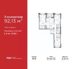 3-комн. квартира в Клубный квартал "Ассамблея" на 9 этаже. Квартира без отделки, новый владелец может сделать ремонт по индивидуальному проекту. Общая площадь: 92.13 кв.м., жилая: 45.08 кв.м., площадь просторной кухни-столовой: 20.64 кв.м. Квартира - распашонка, без проходных комнат, окна выходят на paзные стороны дома. В квартире одна лоджия, два совмещенных и один раздельный санузел. Высота потолков 3.0 м.