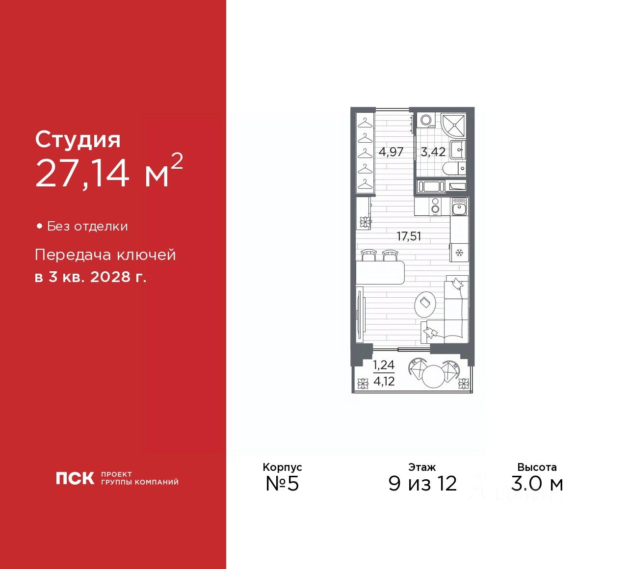 1-комн. квартира-студия от застройщика в Клубный квартал "Ассамблея" на 9 этаже. Квартира без отделки, новый владелец может сделать ремонт по своему дизайн-проекту. Общая площадь: 27.14 кв.м., площадь гостиной 17.51 кв.м., из которых 5 кв.м. выделено под кухонную зону. Все окна выходят на одну сторону. В квартире один балкон, один совмещенный санузел. Высота потолков 3.0 м.
