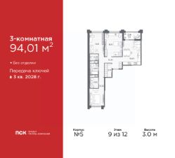3-комн. квартира в Клубный квартал "Ассамблея" на 9 этаже. Квартира без отделки, новый владелец может сделать ремонт по своему проекту. Общая площадь: 94.01 кв.м., жилая: 44.88 кв.м., площадь просторной кухни-столовой: 19.34 кв.м. Квартира - распашонка, без проходных комнат, окна выходят на paзные стороны дома. В квартире одна лоджия, два совмещенных и один раздельный санузел. Высота потолков 3.0 м.