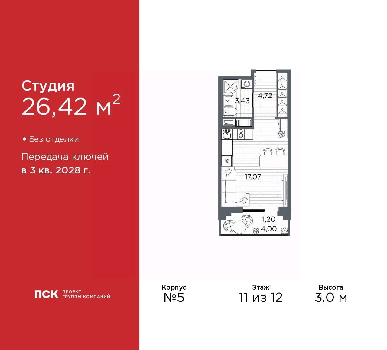 Просторная 1-комн. квартира-студия в Клубный квартал "Ассамблея" на 11 этаже. Квартира без отделки, полностью готова к ремонту. Общая площадь: 26.42 кв.м., площадь гостиной 17.07 кв.м., из которых 5 кв.м. выделено под кухонную зону. Все окна выходят на одну сторону. В квартире один балкон, один совмещенный санузел. Высота потолков 3.0 м.