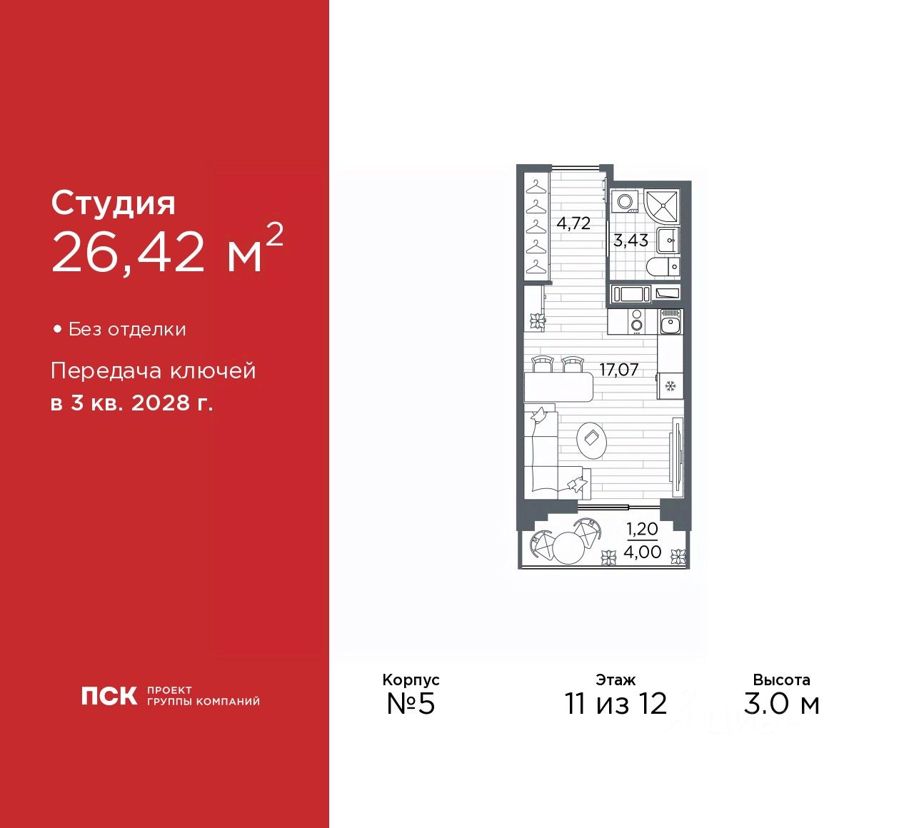 1-комн. квартира-студия в Клубный квартал "Ассамблея" на 11 этаже. Квартира без отделки, после получения ключей можно делать ремонт. Общая площадь: 26.42 кв.м., площадь гостиной 17.07 кв.м., из которых 5 кв.м. выделено под кухонную зону. Все окна выходят на одну сторону. В квартире один балкон, один совмещенный санузел. Высота потолков 3.0 м.