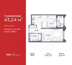 Продается 1-комн. квартира в Клубный квартал "Ассамблея" на 1 этаже. Квартира без отделки, полностью готова к ремонту. Общая площадь: 43.24 кв.м., жилая: 15.23 кв.м., площадь просторной кухни-столовой: 16.77 кв.м. Все окна выходят на одну сторону. В квартире одна лоджия, один совмещенный санузел. Высота потолков 3.0 м.