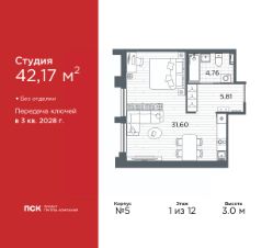 1-комн. квартира-студия от застройщика в Клубный квартал "Ассамблея" на 1 этаже. Квартира без отделки, полностью готова к ремонту. Общая площадь: 42.17 кв.м., площадь гостиной 31.6 кв.м., из которых 10 кв.м. выделено под кухонную зону. Все окна выходят на одну сторону. В квартире один совмещенный санузел. Высота потолков 3.0 м.