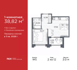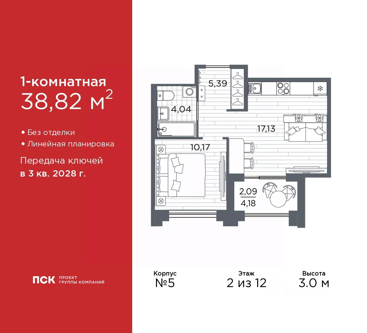 1-комн. квартира в Клубный квартал "Ассамблея" на 2 этаже. Квартира без отделки, новый владелец может сделать ремонт по индивидуальному дизайн-проекту. Общая площадь: 38.82 кв.м., жилая: 10.17 кв.м., площадь просторной кухни-столовой: 17.13 кв.м. Все окна выходят на одну сторону. В квартире одна лоджия, один совмещенный санузел. Высота потолков 3.0 м.