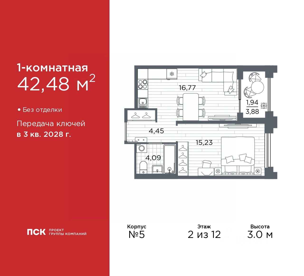 Просторная 1-комн. квартира в Клубный квартал "Ассамблея" на 2 этаже. Квартира без отделки, полностью готова к чистовой отделке и дальнейшему ремонту. Общая площадь: 42.48 кв.м., жилая: 15.23 кв.м., площадь просторной кухни-столовой: 16.77 кв.м. Все окна выходят на одну сторону. В квартире одна лоджия, один совмещенный санузел. Высота потолков 3.0 м.