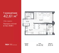 Однокомнатная квартира от застройщика в Клубный квартал "Ассамблея" на 4 этаже. Квартира без отделки, после оформления собственности можно делать ремонт. Общая площадь: 42.61 кв.м., жилая: 15.23 кв.м., площадь просторной кухни-столовой: 16.77 кв.м. Все окна выходят на одну сторону. В квартире одна лоджия, один совмещенный санузел. Высота потолков 3.0 м.