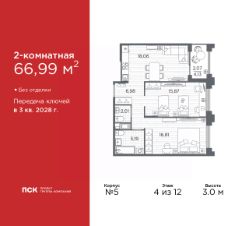 Продается двухкомнатная квартира от застройщика в Клубный квартал "Ассамблея" на 4 этаже. Квартира без отделки, после оформления собственности можно делать ремонт. Общая площадь: 66.99 кв.м., жилая: 32.68 кв.м., площадь просторной кухни-столовой: 18.06 кв.м. Комнаты изолированные, все окна выходят на одну сторону. В квартире одна лоджия, один совмещенный и один раздельный санузел. Высота потолков 3.0 м.