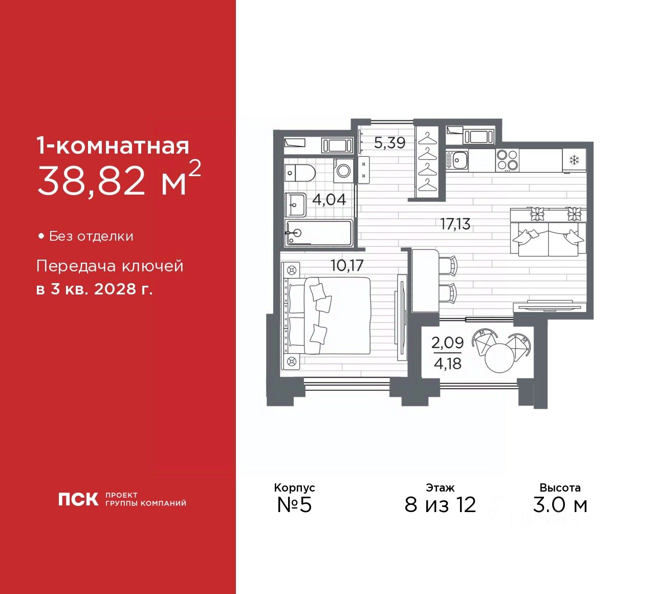 1-комн. квартира в Клубный квартал "Ассамблея" на 8 этаже. Квартира без отделки, полностью готова к ремонту. Общая площадь: 38.82 кв.м., жилая: 10.17 кв.м., площадь просторной кухни-столовой: 17.13 кв.м. Все окна выходят на одну сторону. В квартире одна лоджия, один совмещенный санузел. Высота потолков 3.0 м.