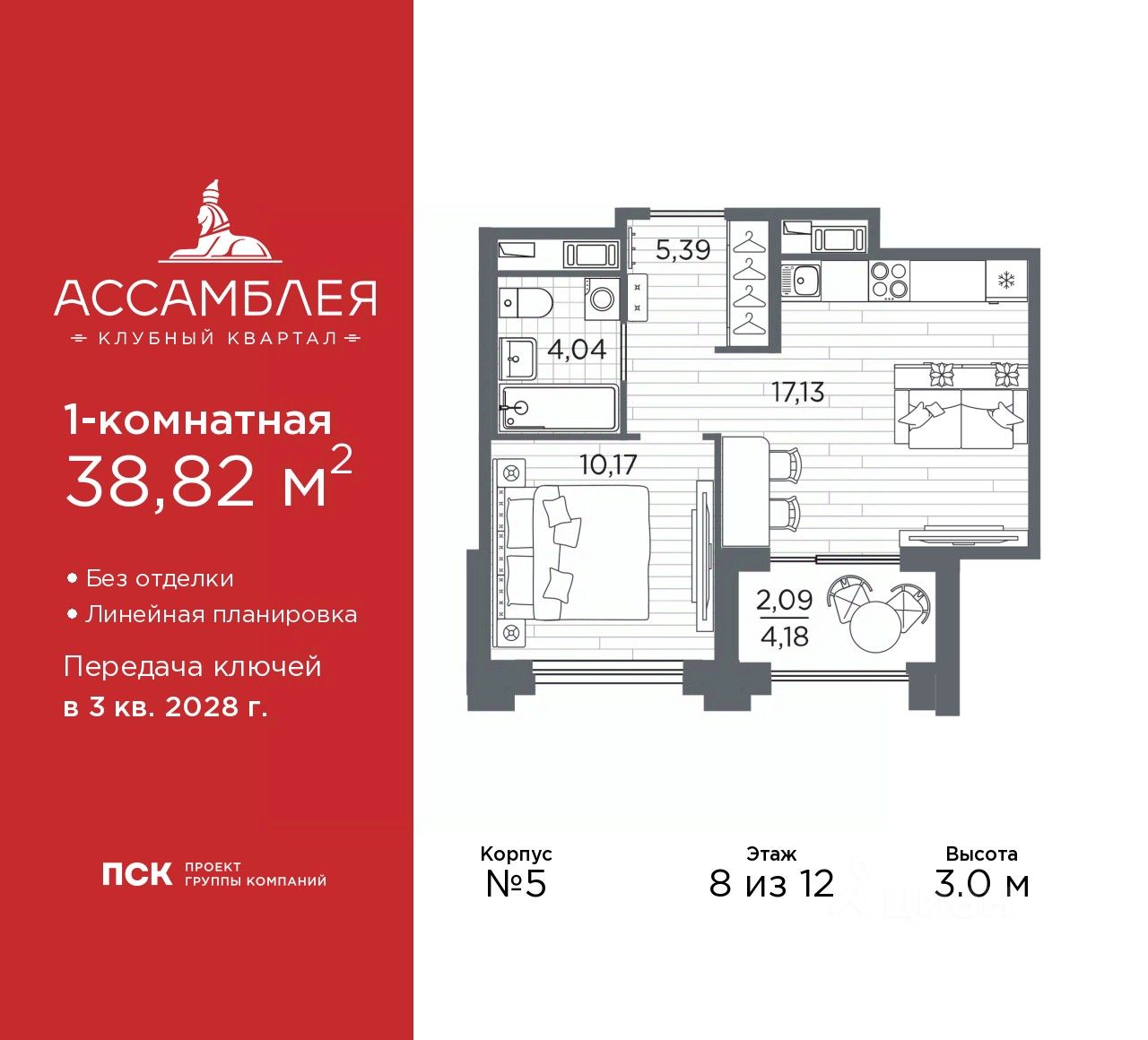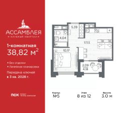 Просторная 1-комн. квартира в Клубный квартал "Ассамблея" на 8 этаже. Квартира без отделки, после оформления собственности можно делать ремонт. Общая площадь: 38.82 кв.м., жилая: 10.17 кв.м., площадь просторной кухни-столовой: 17.13 кв.м. Все окна выходят на одну сторону. В квартире одна лоджия, один совмещенный санузел. Высота потолков 3.0 м.