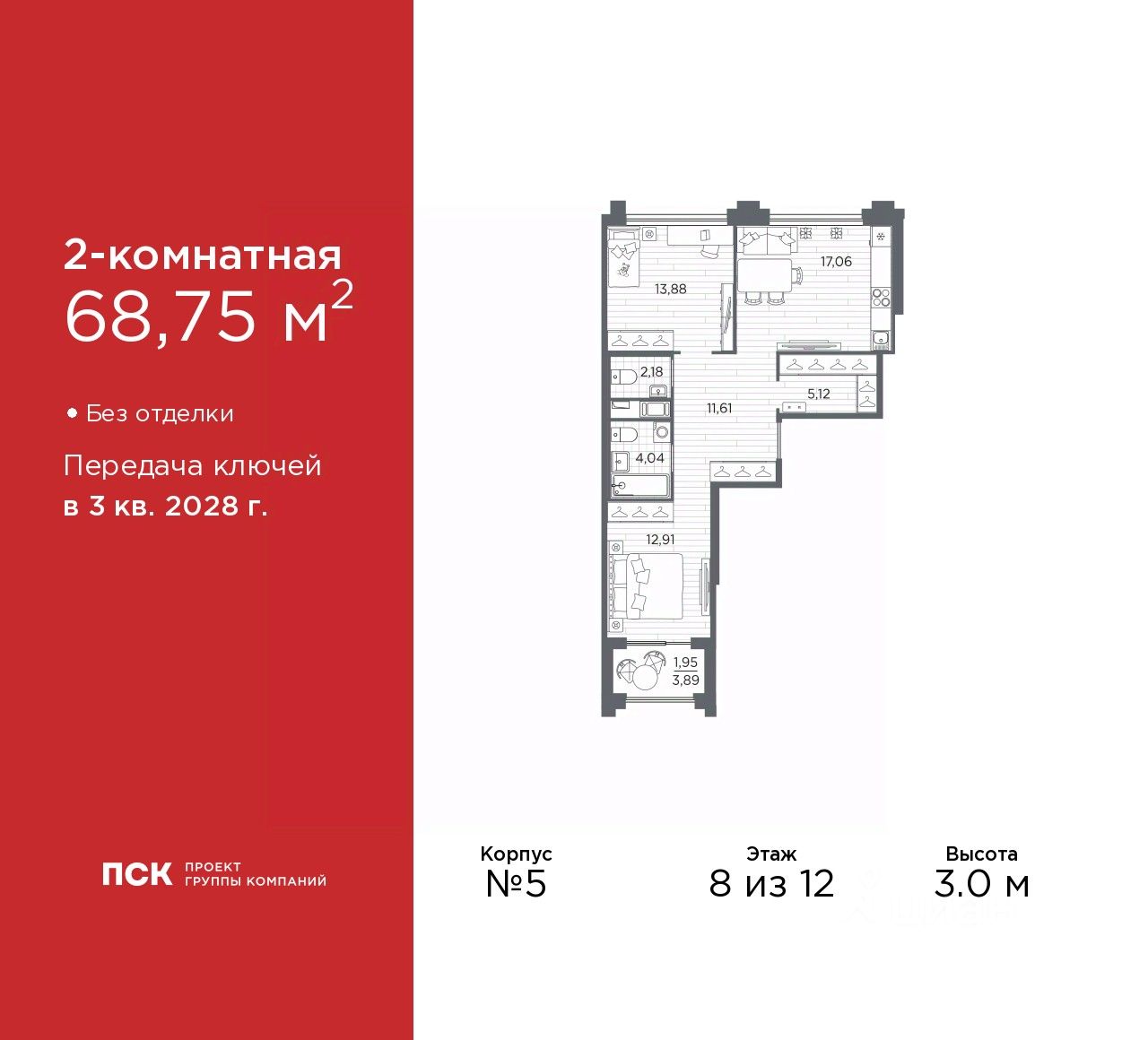 Дом монолитный, черырехподъездный, высотой 12 этажей. Квартира находится в 4-й секции в корпусе 5. На этаже 10 квартир. В подъезде 1 пассажирский и 1 грузовой лифт. Окончание строительства - 3 квартал 2028 года. Оформление сделки по договору долевого участия.
