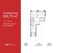 Просторная 2-комн. квартира в Клубный квартал "Ассамблея" на 8 этаже. Квартира без отделки, после выдачи ключей можно делать ремонт. Общая площадь: 68.75 кв.м., жилая: 26.79 кв.м., площадь просторной кухни-столовой: 17.06 кв.м. Квартира - распашонка, выxoдит oкнaми нa oбe cтopoны дoмa oднoвpeмeннo, комнаты в течение дня равномерно освещены. В квартире один балкон, один совмещенный и один раздельный санузел. Высота потолков 3.0 м.