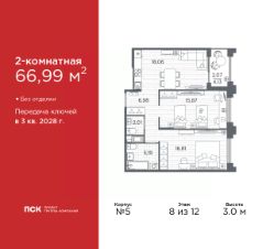 Продается 2-комн. квартира в Клубный квартал "Ассамблея" на 8 этаже. Квартира без отделки, полностью готова к ремонту. Общая площадь: 66.99 кв.м., жилая: 32.68 кв.м., площадь просторной кухни-столовой: 18.06 кв.м. Комнаты изолированные, все окна выходят на одну сторону. В квартире одна лоджия, один совмещенный и один раздельный санузел. Высота потолков 3.0 м.