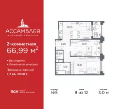 Продается 2-комн. квартира в Клубный квартал "Ассамблея" на 8 этаже. Квартира без отделки, после получения ключей можно делать ремонт. Общая площадь: 66.99 кв.м., жилая: 32.68 кв.м., площадь просторной кухни-столовой: 18.06 кв.м. Комнаты изолированные, все окна выходят на одну сторону. В квартире одна лоджия, один совмещенный и один раздельный санузел. Высота потолков 3.0 м.