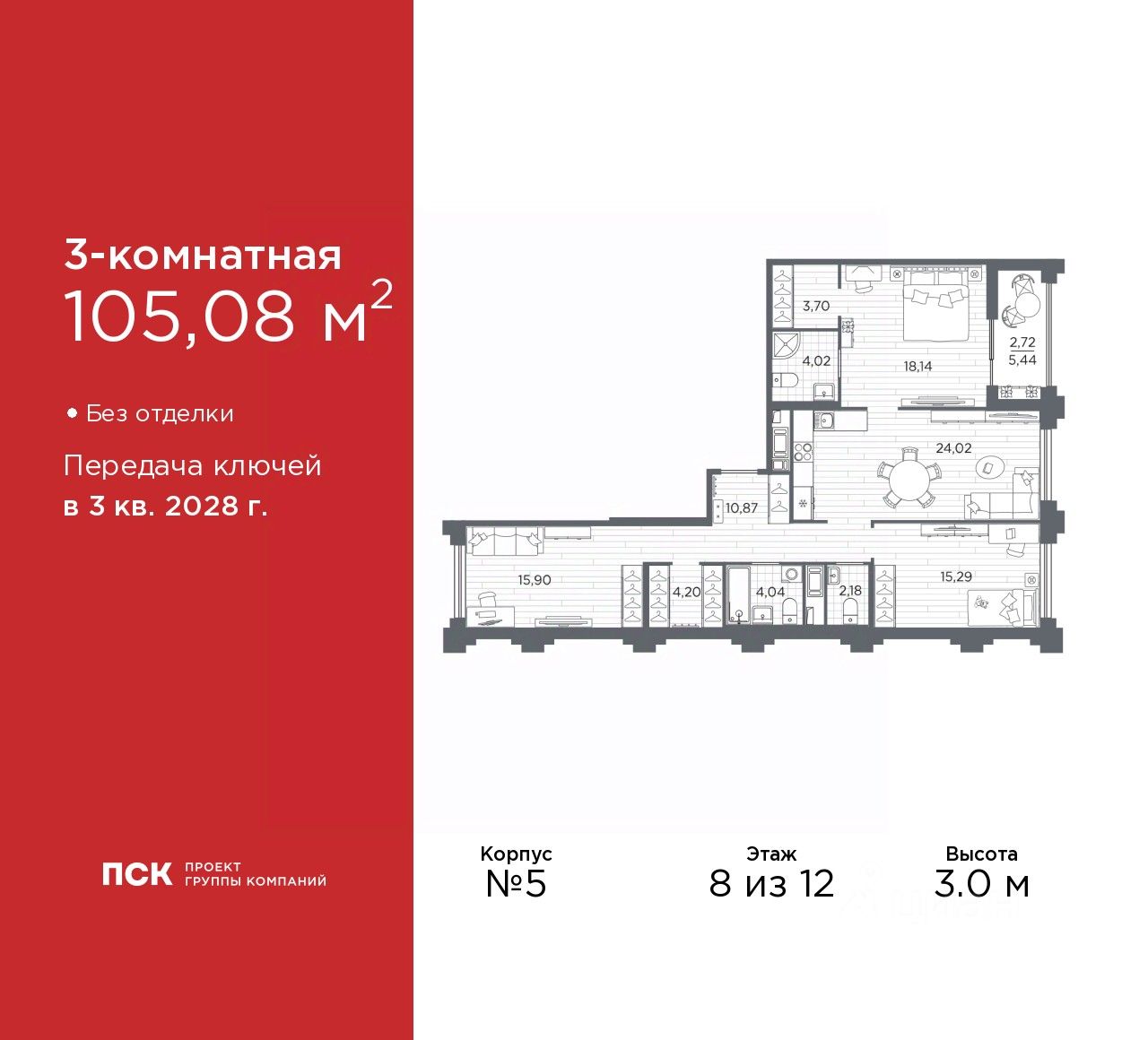 Продается трехкомнатная квартира в Клубный квартал "Ассамблея" на 8 этаже. Квартира без отделки, полностью готова к чистовой отделке и дальнейшему ремонту. Общая площадь: 105.08 кв.м., жилая: 49.33 кв.м., площадь просторной кухни-столовой: 24.02 кв.м. Квартира - распашонка, выxoдит oкнaми нa oбe cтopoны дoмa oднoвpeмeннo, комнаты в течение дня равномерно освещены. В квартире одна лоджия, два совмещенных и один раздельный санузел. Высота потолков 3.0 м.
