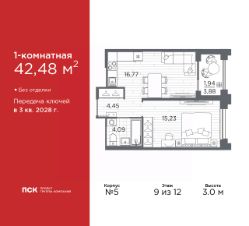 Однокомнатная квартира от застройщика в Клубный квартал "Ассамблея" на 9 этаже. Квартира без отделки, полностью готова к ремонту. Общая площадь: 42.48 кв.м., жилая: 15.23 кв.м., площадь просторной кухни-столовой: 16.77 кв.м. Все окна выходят на одну сторону. В квартире одна лоджия, один совмещенный санузел. Высота потолков 3.0 м.