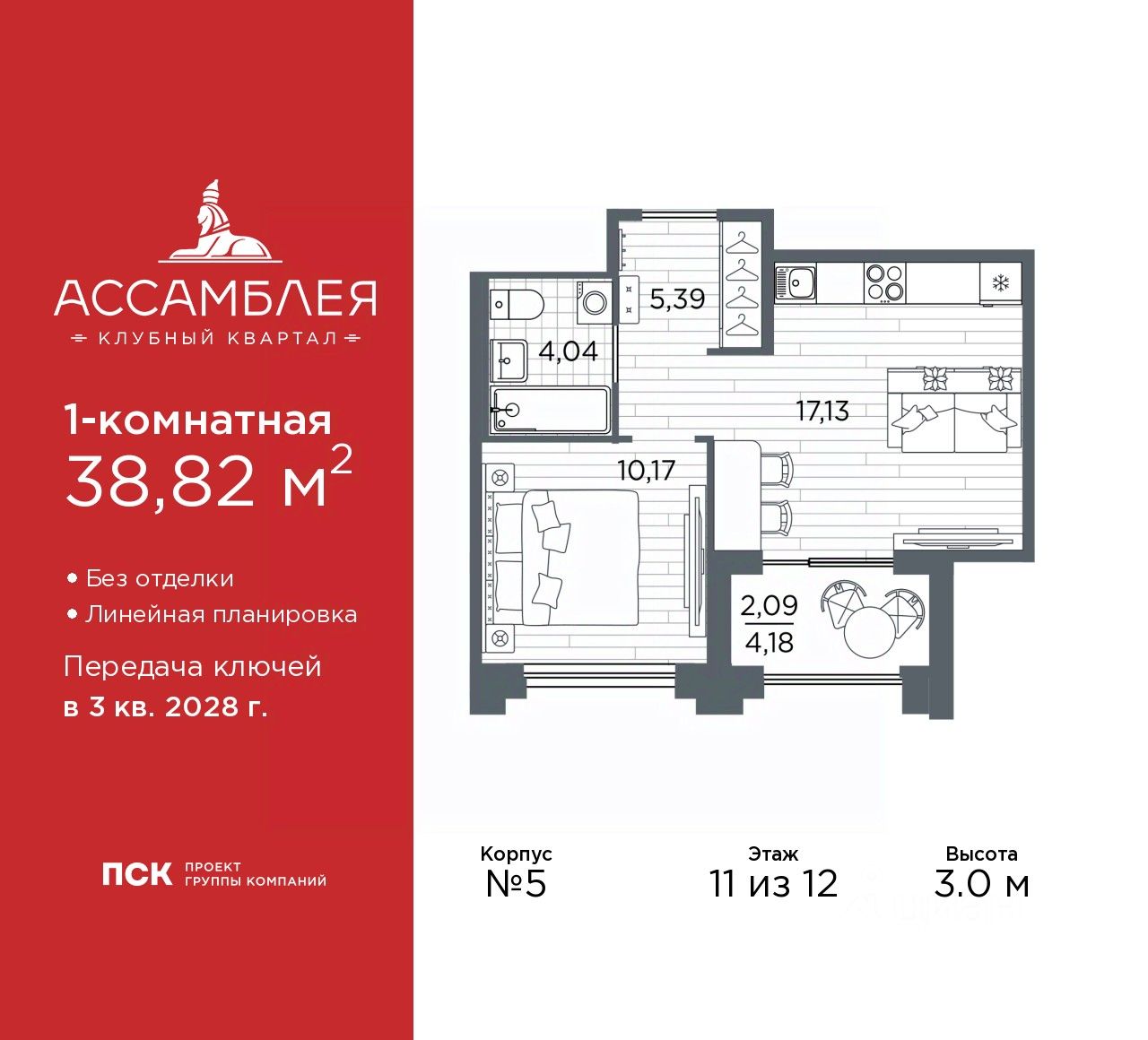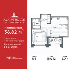 Продается 1-комн. квартира в Клубный квартал "Ассамблея" на 11 этаже. Квартира без отделки, после оформления собственности можно делать ремонт. Общая площадь: 38.82 кв.м., жилая: 10.17 кв.м., площадь просторной кухни-столовой: 17.13 кв.м. Все окна выходят на одну сторону. В квартире одна лоджия, один совмещенный санузел. Высота потолков 3.0 м.