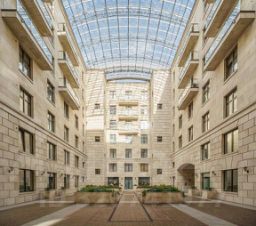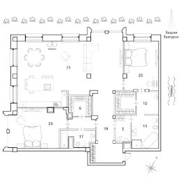 Планировка включает в себя гостеприимный холл, две отдельные мастер-спальни, каждая со своей ванной комнатой и гардеробной и большую гостевую зону, которая визуально поделена на три зоны — кухню, обеденную зону и зону отдыха, где расположившись на удобном диване Вы будете любоваться видами на парк.