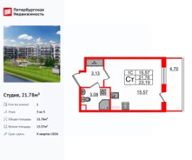Удобная, классическая, функциональная европланировка, вместительная прихожая 3.13 м². Общая площадь студии - 21.78 м², жилая 15.57 м², высота потолка 3.07 м.