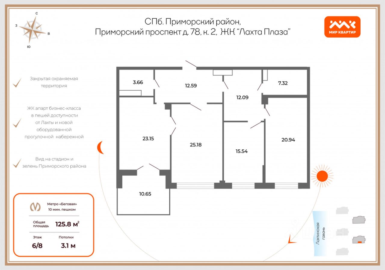 Евро 3-х комнатные апартаменты общей площадью 125,8 кв.м. расположились на 6 этаже 8 этажного дома. Из окон открываются приятные виды на акваторию Финского залива и Стадион.