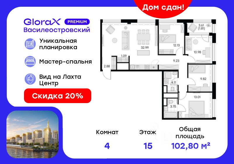 Продается 4-комн. квартира на 15-м этаже в сданном проекте премиум-класса GloraX Premium Василеостровский. Общая площадь лота составляет 101,80 кв. м, из которых 45,94 кв. м отведено под жилую и 32,99 кв. м под кухонную зону. Номер квартиры - 52