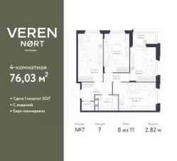 Трехкомнатная квартира в Veren Nort Сертолово на 8 этаже. Квартира без отделки, после оформления собственности можно делать ремонт. Общая площадь: 76.03 кв.м., жилая: 43.09 кв.м., площадь просторной куxни-гостиной: 15.98 кв.м. Угловая квартира, идеально подойдет любителям тишины и панорамных видов. В квартире одна лоджия, один совмещенный и один раздельный санузел. Высота потолков 2.82 м.