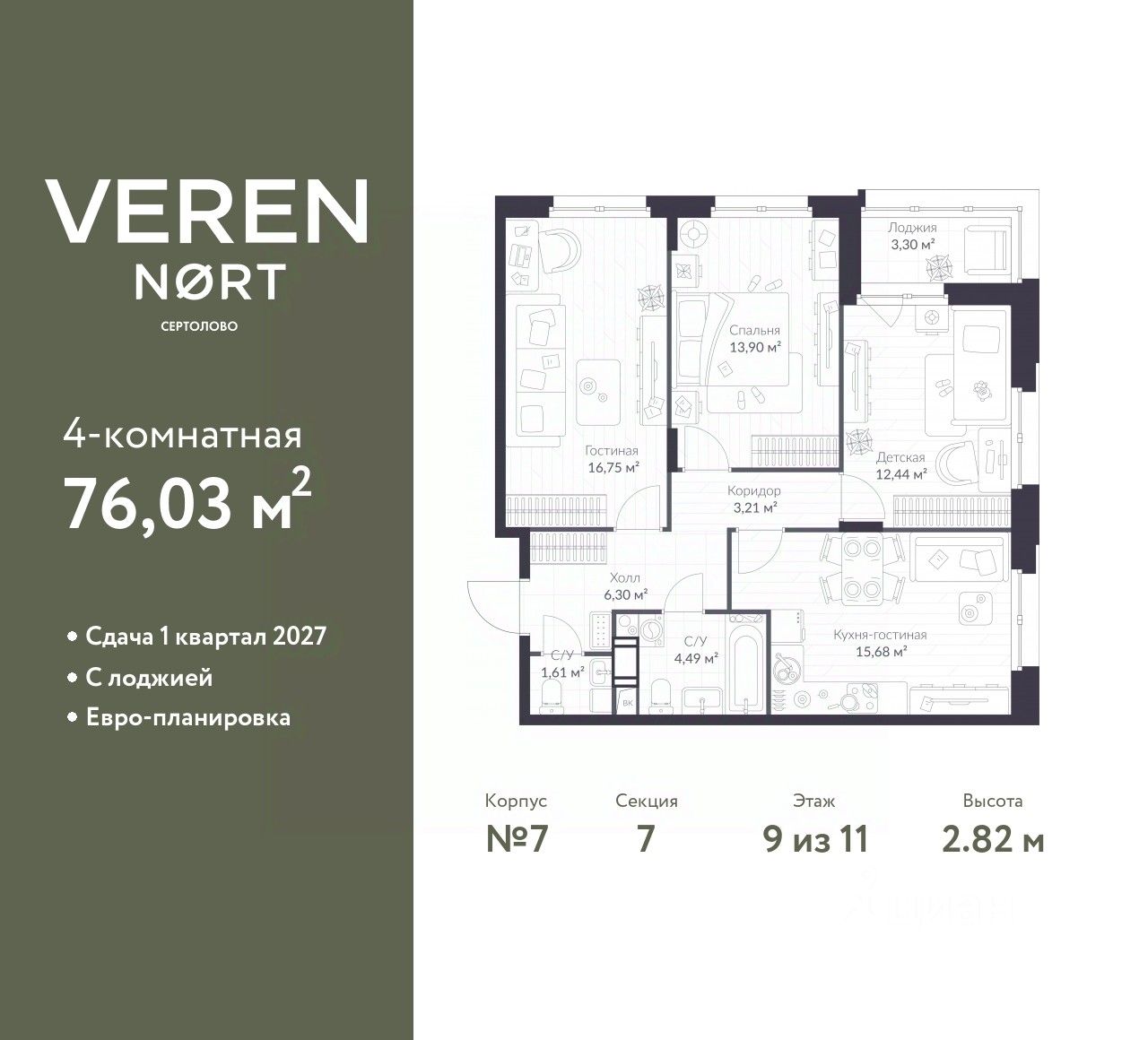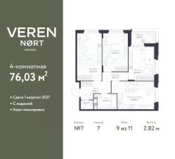 3-комн. квартира в Veren Nort Сертолово на 9 этаже. Квартира без отделки, после получения ключей можно делать ремонт. Общая площадь: 76.03 кв.м., жилая: 43.09 кв.м., площадь просторной куxни-гостиной: 15.98 кв.м. Квартира угловая, очень светлая, естественная вентиляция при открытии окон. В квартире одна лоджия, один совмещенный и один раздельный санузел. Высота потолков 2.82 м.