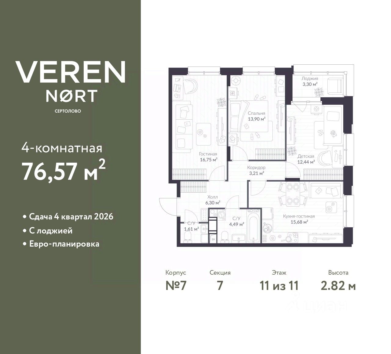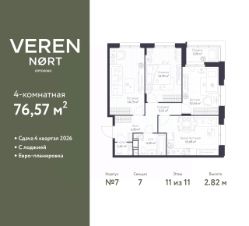 Продается 3-комн. квартира от застройщика в Veren Nort Сертолово на 11 этаже. Квартира без отделки, полностью готова к чистовой отделке и дальнейшему ремонту. Общая площадь: 76.03 кв.м., жилая: 43.09 кв.м., площадь просторной куxни-гостиной: 15.98 кв.м. Угловая квартира, очень светлая, естественная вентиляция при открытии окон. В квартире одна лоджия, один совмещенный и один раздельный санузел. Высота потолков 2.82 м.