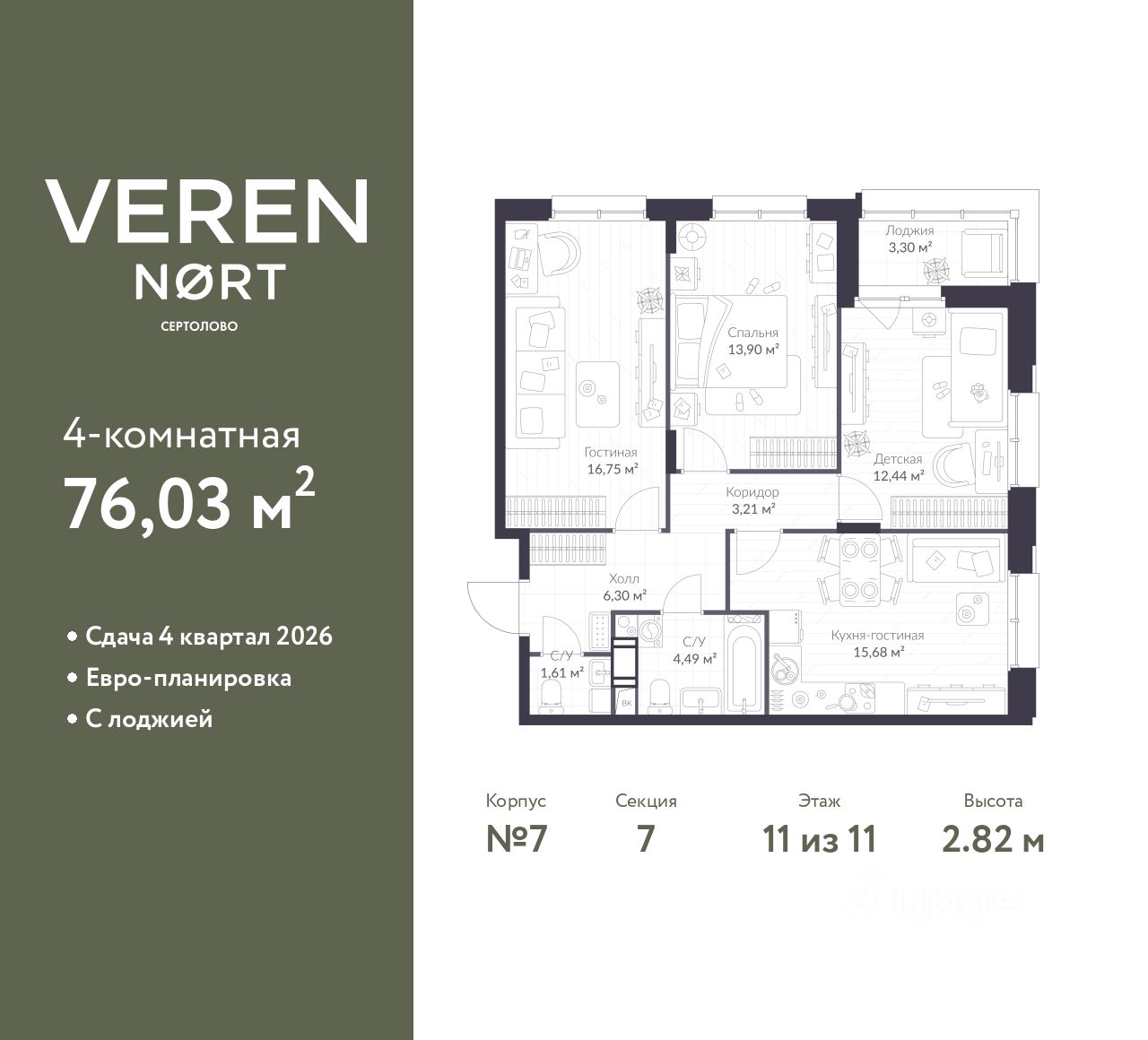 3-комн. квартира от застройщика в Veren Nort Сертолово на 11 этаже. Квартира без отделки, полностью готова к ремонту. Общая площадь: 76.03 кв.м., жилая: 43.09 кв.м., площадь просторной куxни-гостиной: 15.98 кв.м. Угловая квартира, идеально подойдет любителям тишины и панорамных видов. В квартире одна лоджия, один совмещенный и один раздельный санузел. Высота потолков 2.82 м.