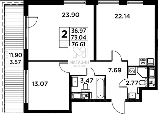 Квартира с предчистовой отделкой, большой кухней- гостинной 22 м.кв. и террасой 12 м.кв.