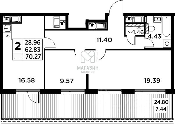 Квартира с предчистовой отделкой, большой кухней- гостинной 19.4 м.кв. и террасой 24.8 м.кв.