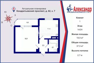 Общая площадь 37,5 кв.м, жилая площадь 18,9 кв.м, кухня 11 кв.м, совмещенный санузел с ванной - 4,1 кв.м, застекленный балкон 4,4 кв.м. Состояние квартиры - заходи и живи.
