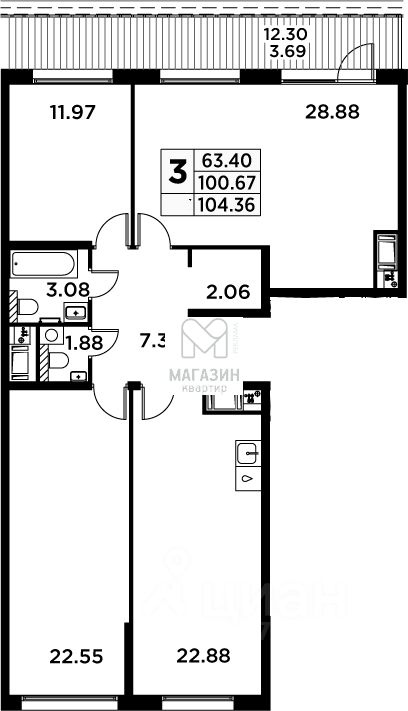 Квартира с предчистовой отделкой, большой кухней- гостинной 29 м.кв. и террасой 12.5 м.кв.
