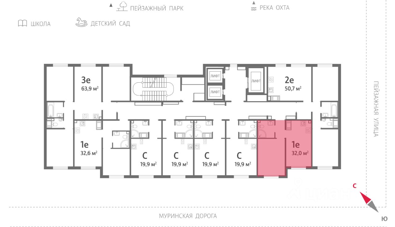 Вдоль леса и рядом с рекой Охта. К 2026 году на берегах реки Охты будет создан Пейзажный парк с летними экотропами и зимними горками для тюбингов, скейт-парком и летним кинотеатром.