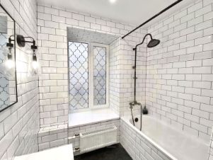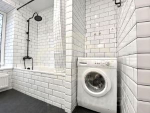 Просторная ванна с окном в кафеле, есть ниша под стиральную машину.