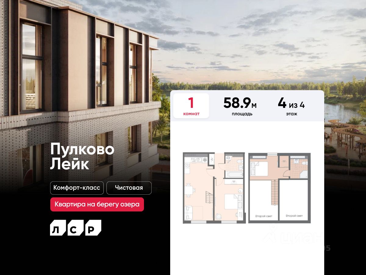 Продается 1-комнатная квартира в ЖК "Пулково Лейк" на 4 этаже. Общая площадь составляет 58.90 кв. м. Квартира с чистовой отделкой. Жилой комплекс "Пулково Лейк" располагается по адресу Санкт-Петербург, Московский.