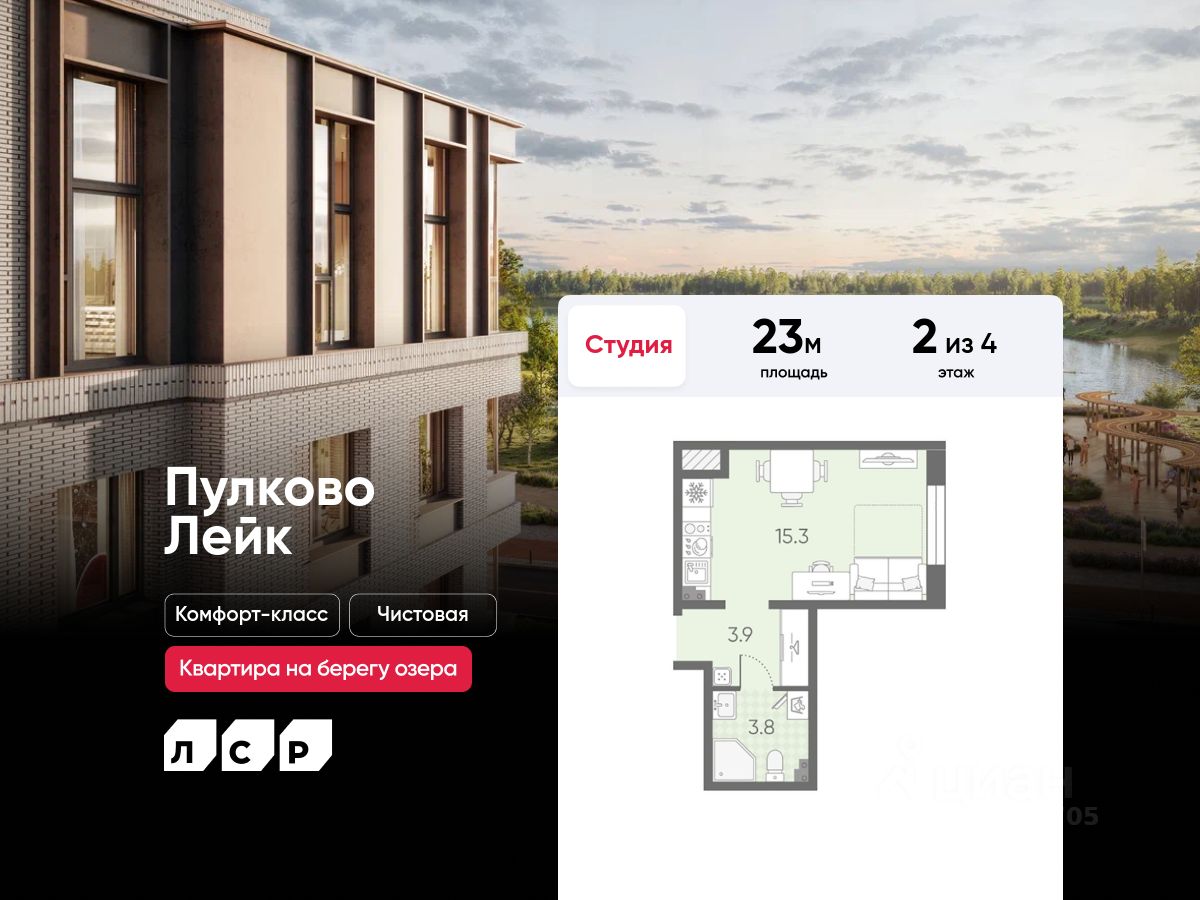 Продается студия в ЖК "Пулково Лейк" на 2 этаже. Общая площадь составляет 23.00 кв. м. Квартира с чистовой отделкой. Жилой комплекс "Пулково Лейк" располагается по адресу Санкт-Петербург, Московский.