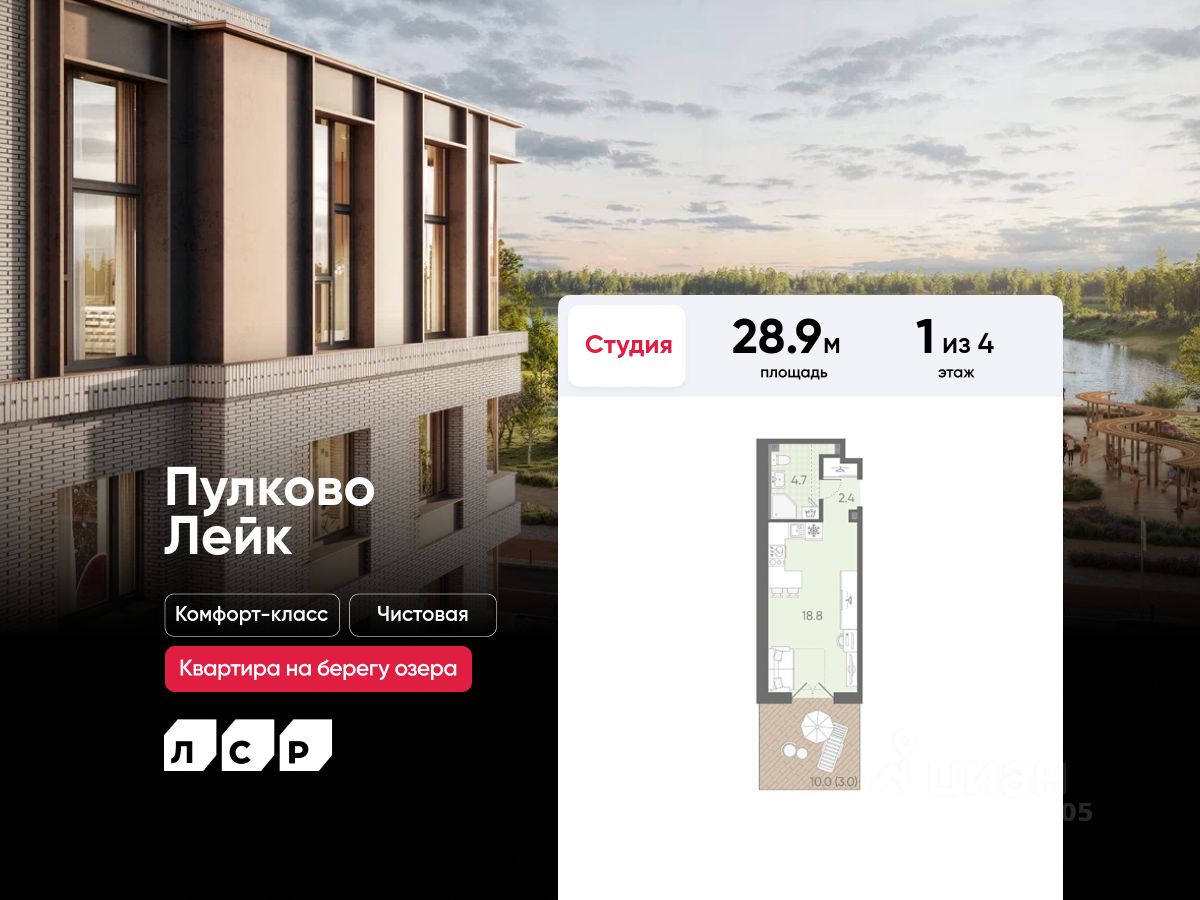Продается студия в ЖК "Пулково Лейк" на 1 этаже. Общая площадь составляет 28.90 кв. м. Квартира с чистовой отделкой. Жилой комплекс "Пулково Лейк" располагается по адресу Санкт-Петербург, Московский.