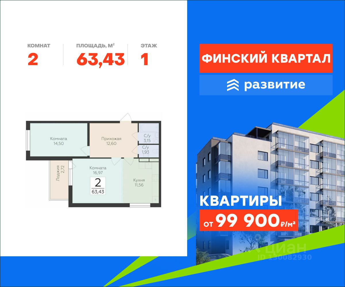 Продается квартира площадью 63.43 кв. м без отделки. Квартира расположена на 1 этаже 7 этажного дома, в жилом комплексе комфорт-класса "Финский Квартал".