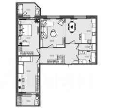 Функциональная планировка квартиры состоит из кухни-гостиной, трех комнат, санузла и двух лоджий.