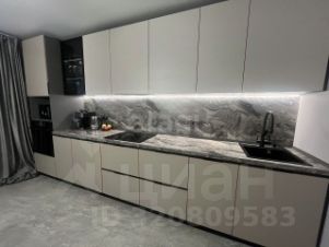 - просторная кухня правильной формы с обустроенным функциональным пространством, на полу уложена кварцвиниловая плитка, качественный кухонный гарнитур со всей техникой (духовой шкаф, индукционная панель, посудомоечная машина);