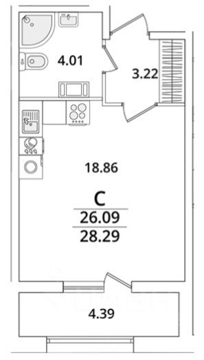 Общая площадь: 26,4 кв.м. + просторная лоджия.