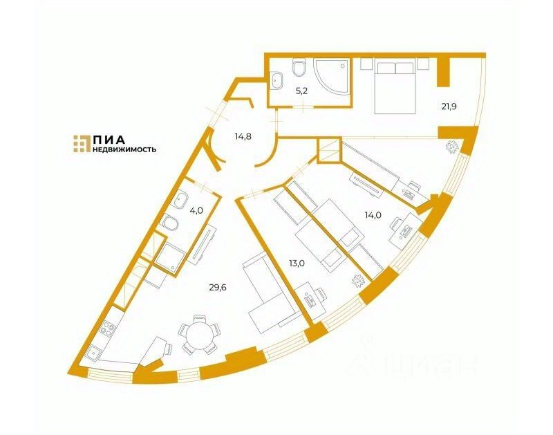 Просторные комнаты 14+13+21,9 кв.м., кухня-гостиная 29,6 кв. м. - это отличный вариант для большой семьи.