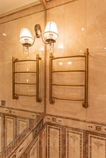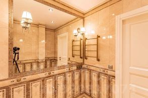 (стоимость ее варьирует от 300 до 500 тыс руб), испанская плитка, мозаика, огромное зеркало, дизайнерский полотенцесушитель. Предусмотрено 3 вида подсветки!